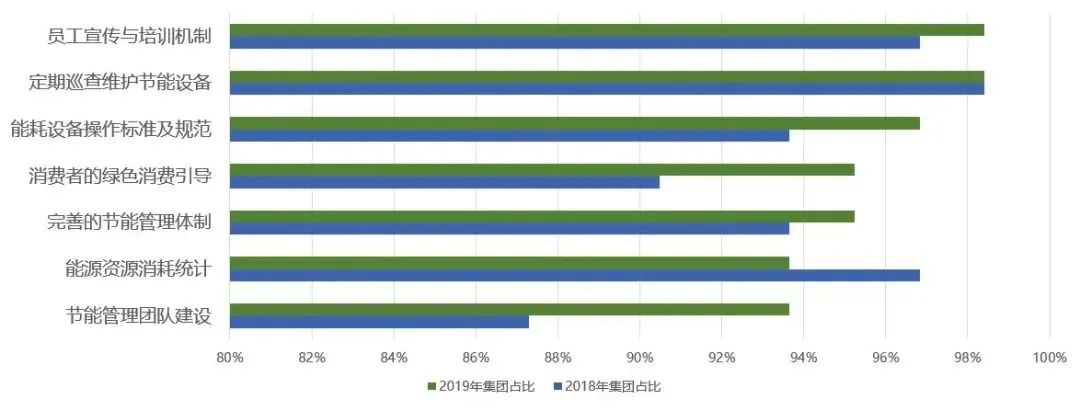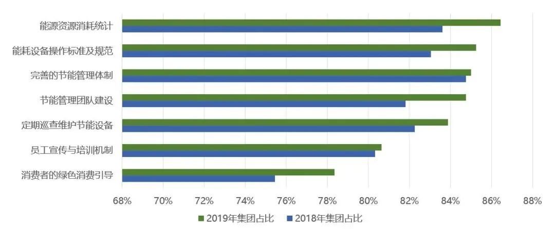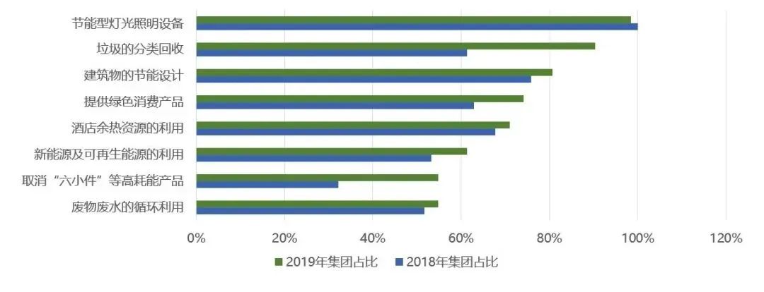 绿色投入占集团全年总运营支出中超过10%以上的比例为15.2%,投入比例小于1%的占26.1%,大部分集团在绿色投入这方面还不算太大。2019年绿色发展制度的实施比2018年有所发展,其中能源消耗统计比2018年减少。另外,各个集团反映的实施绿色发展制度的回报情况,2019年比2018的都增长了。还有节能技术的应用,2019年比2018年在两个领域里变化很大,一个是垃圾的分类回收,一个是取消六小件。