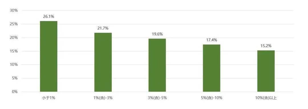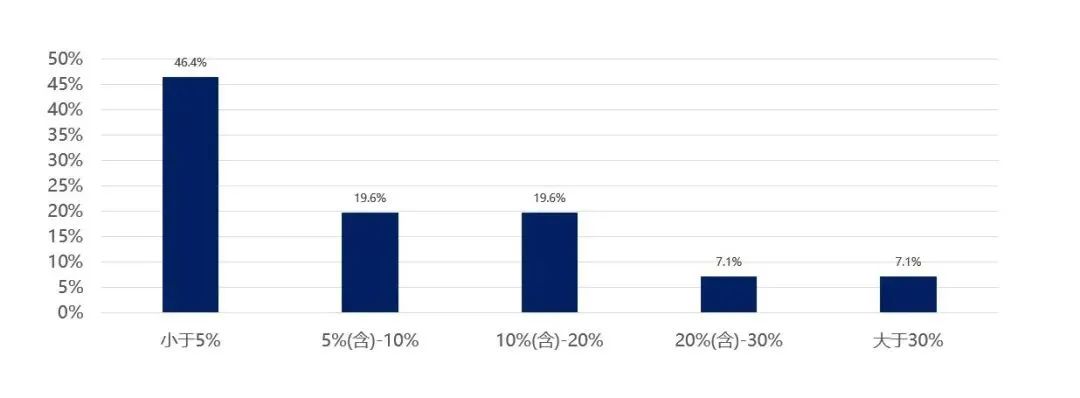 科技投入大于30%的集团占7.1%,小于5%的占46.4%,将近一半的集团科技投入占集团收入的比例小于5%,说明在科技投入方面还有较大潜力。