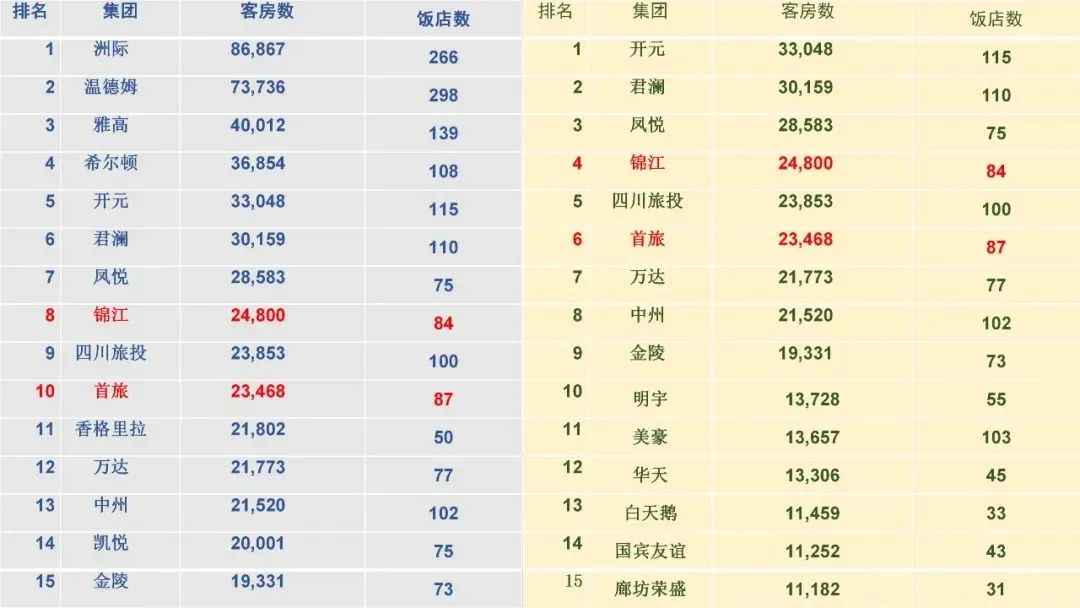 规模排序还有另外一种方式,就是按饭店数量来排,结果是5000家饭店以上的有2家,锦江和华住,3000-4000这个区间有3家,然后是1000以上2000以下的2家,然后就是400到800的区间,然后是200家左右的,还有100家左右的,当然还有更少的。从头部企业看,与按客房量排序基本没有太大变化。