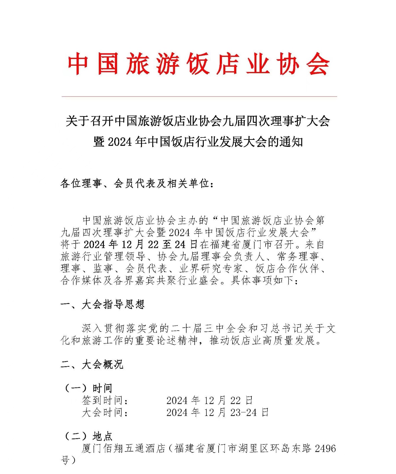 关于召开中国旅游饭店业协会第九届四次理事扩大会暨2024年中国饭店行业发展大会的通知