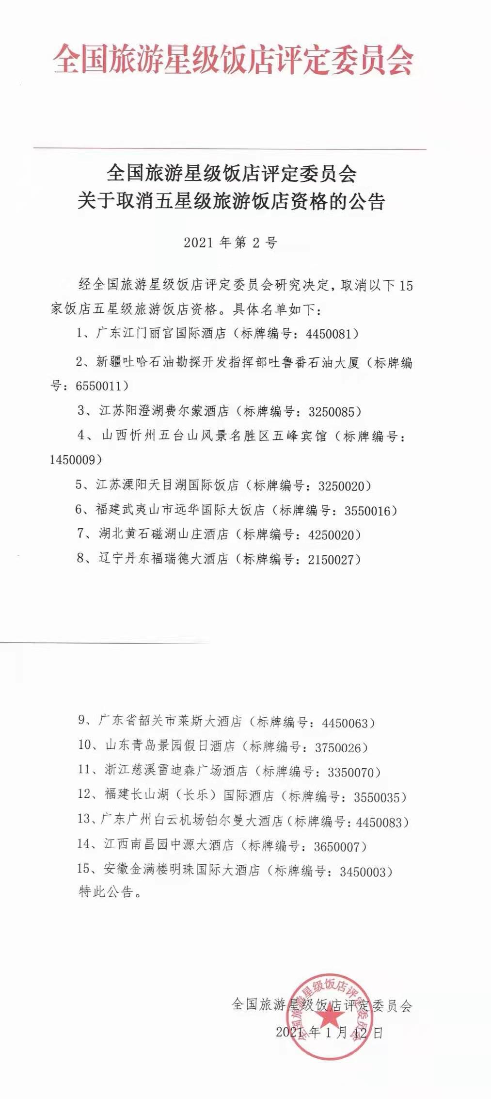 全国旅游星级饭店评定委员会关于取消五星级旅游饭店资格的公告2021年第2号